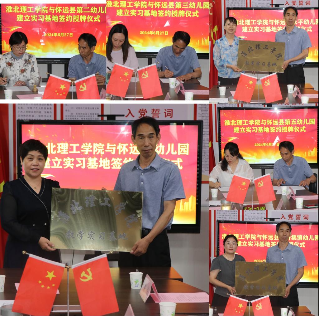 在实践基地的六所幼儿园园长分别对各自园所进行了详细介绍后,怀远县县幼园长刘利代表宣读实践基地签约协议书,双方就协议书的内容进行了充分的交流和沟通。而后在友好而庄重的气氛中,taptap点点体育taptap点点体育副院长谢贤德与六所园所园长分别签订协议书,并举行了授牌仪式,这标志着双方合作迈出了坚实的一步。