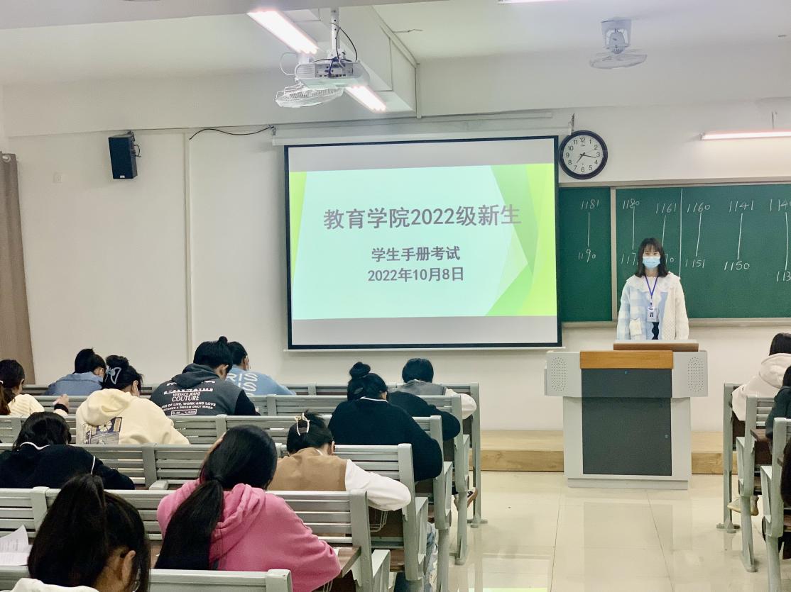 为使2022级新生尽快适应学校的教育教学和生活秩序,帮助新生知悉学校的各项规章制度,树立良好的行为规范,taptap点点体育在组织新生学习学校各项管理规定的基础上,于2022年10月8号晚在1号教学楼开展新生《学生手册》应知应会知识点考试,全院49个新生班级近200名同学参加了考试,全体新生辅导员担任监考工作,学院分管副书记孟向红和团总支负责人黄莹莹担任巡考检查工作。