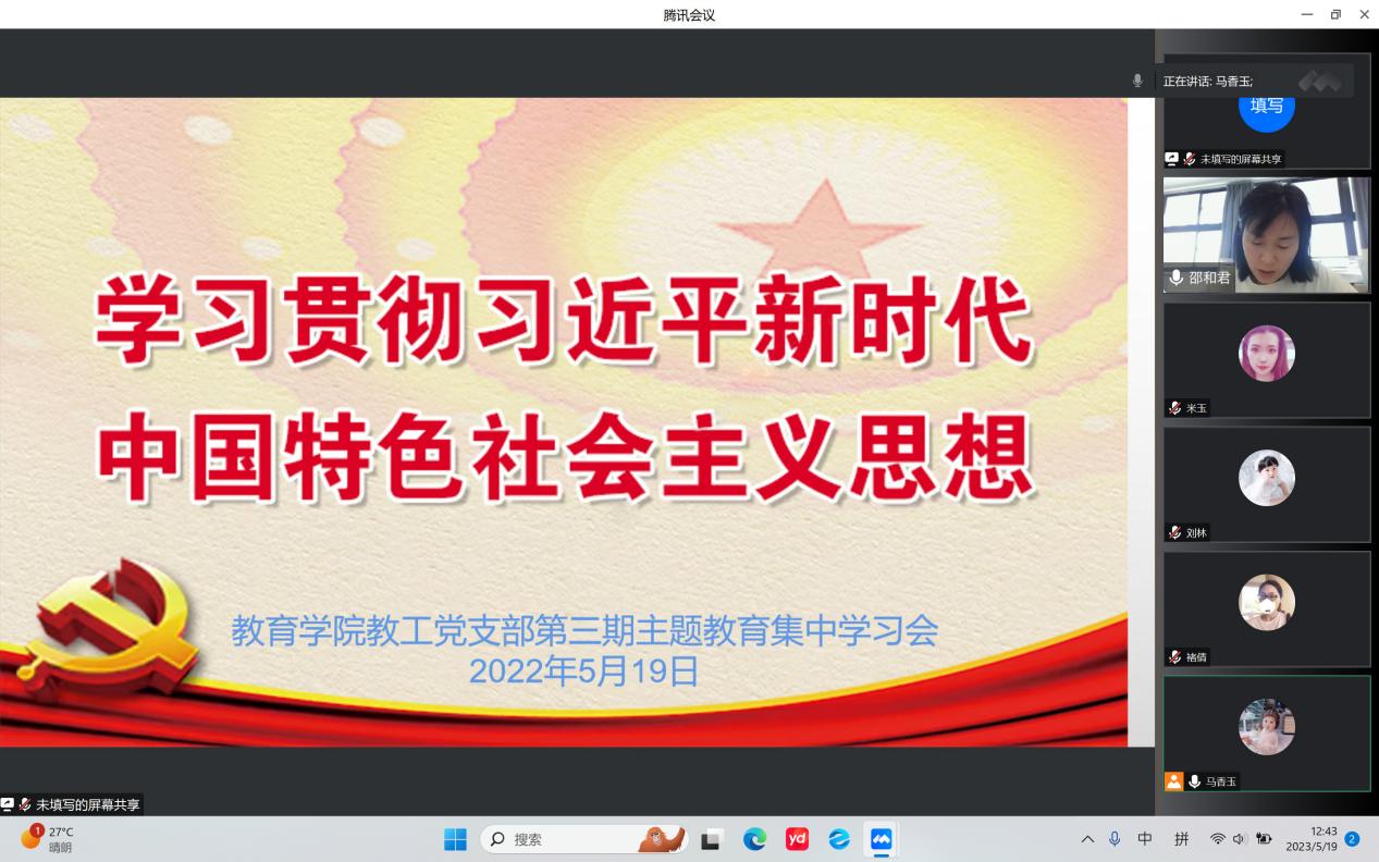5月19日下午,taptap点点体育学习贯彻习近平新时代中国特色社会主义思想主题教育开展第三期读书班党课学习,本次学习会以“线上课堂”形式举行,由教工党支部委员邵和君同志主持并领学。