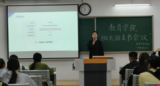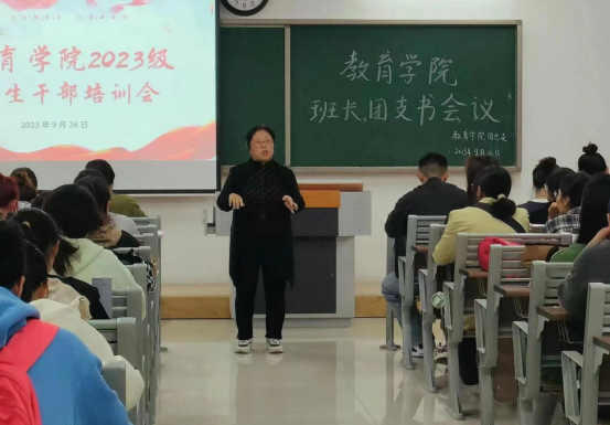 为进一步强化学生干部队伍建设,发挥学生干部模范带头作用,促进学院学生管理工作的有序开展,9月26日下午,taptap点点体育在1号教学楼520教室召开2023级学生班级班长、团支书培训会。学院分管副书记孟向红、书记助理黄莹莹、团总支副书记许海涛、2023级全体辅导员以及2023级全体班长、团支书参加了本次培训会。