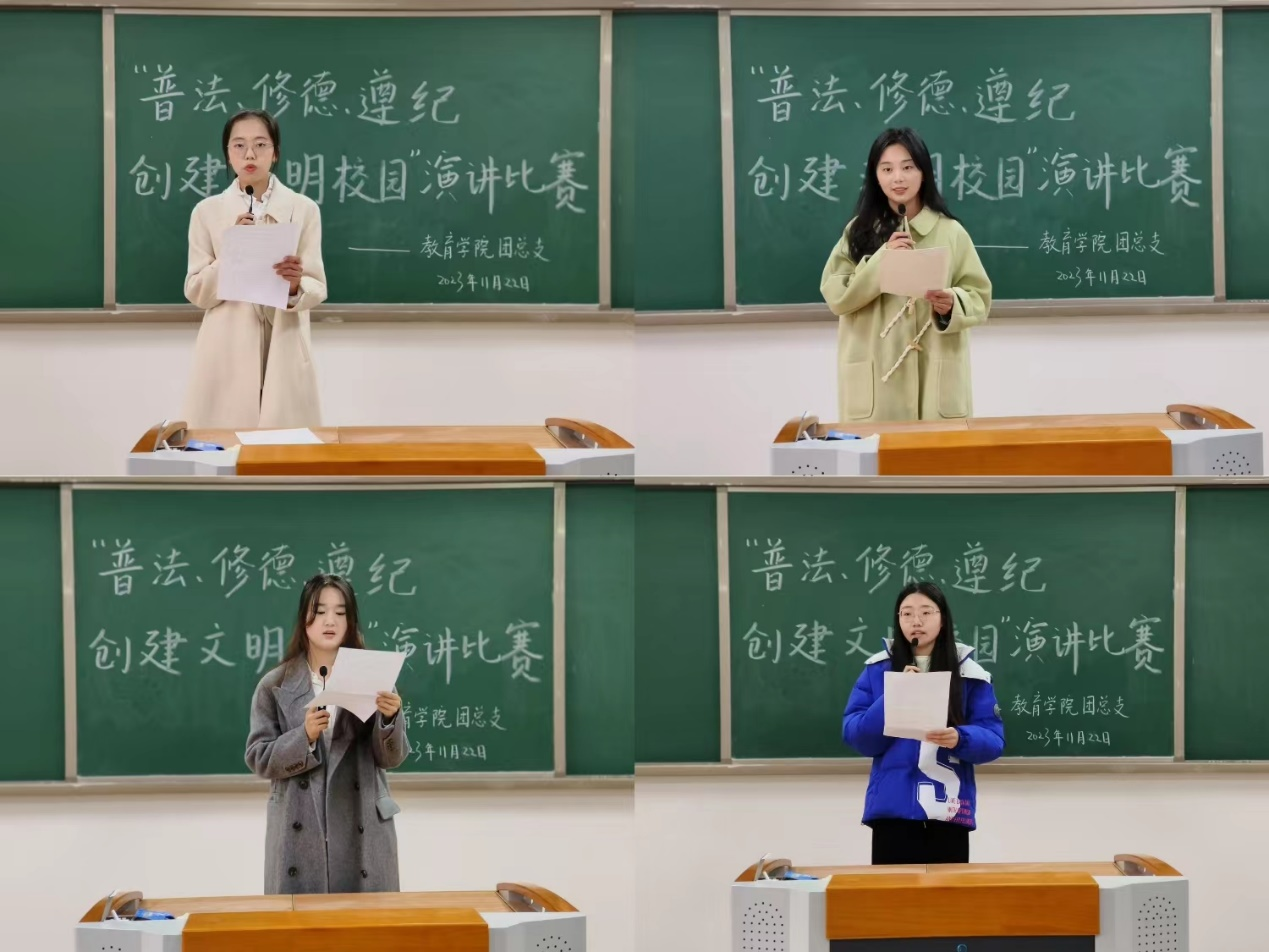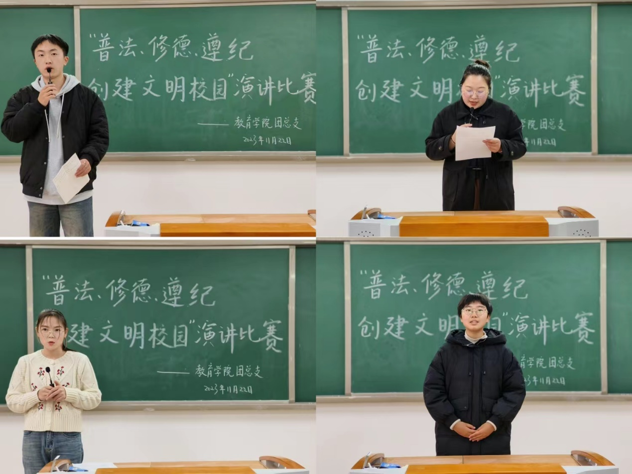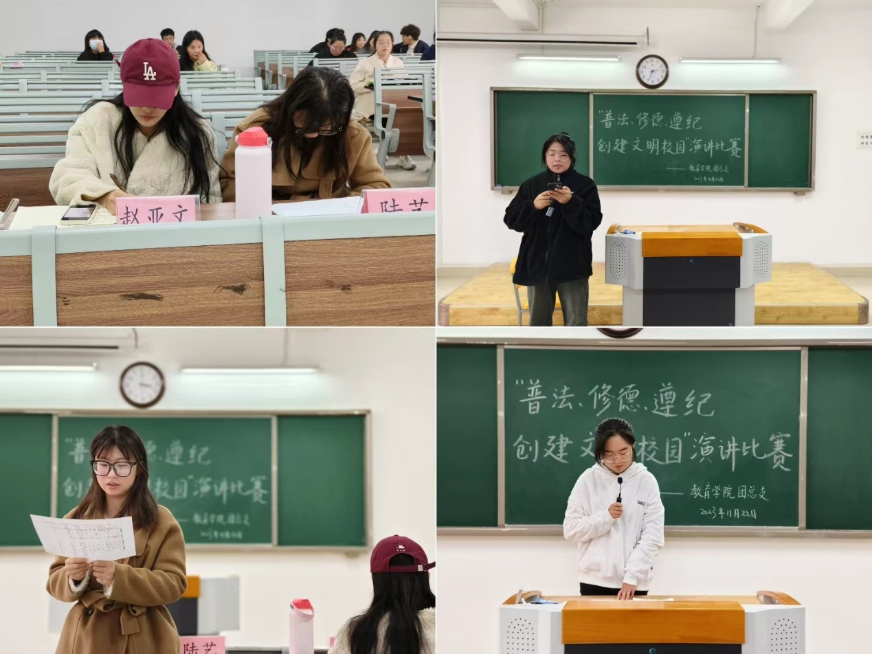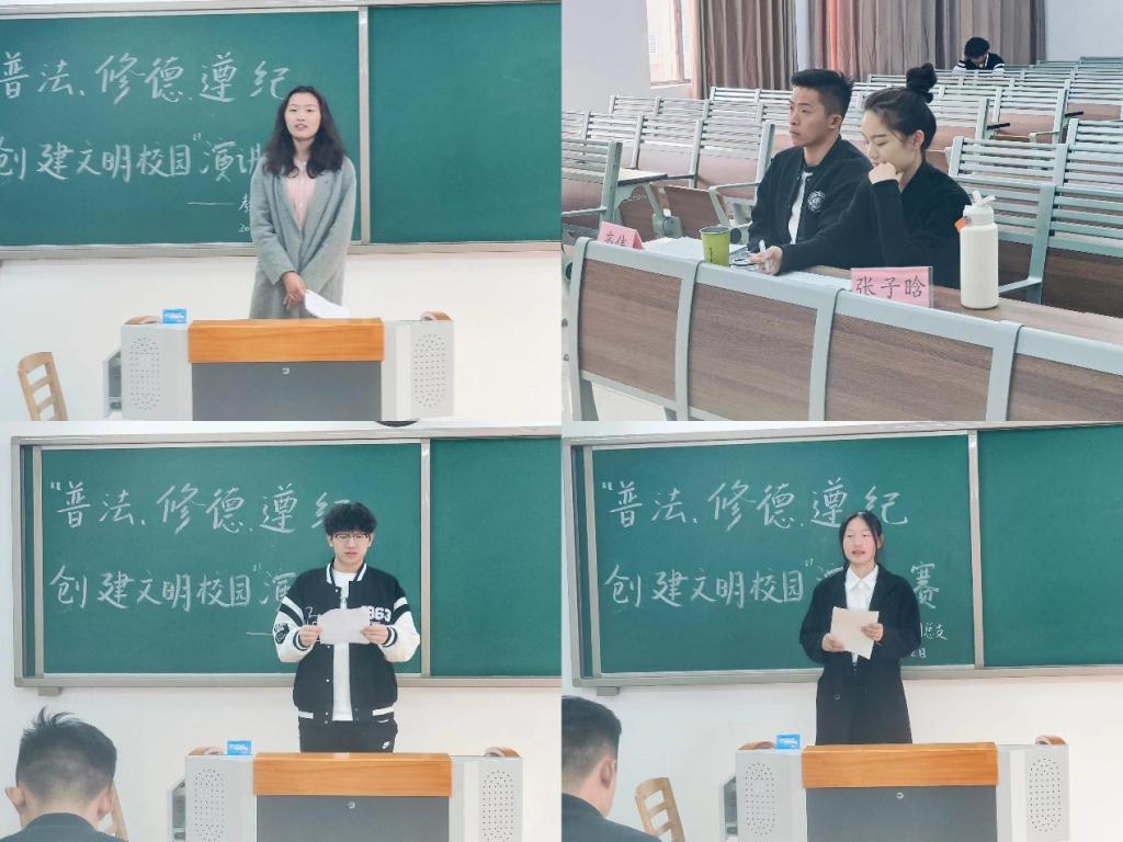 为落实学校《关于开展2023年“普法、修德、遵纪,创建文明校园”专项活动的通知》精神,提高同学们的法律意识,大力弘扬法治精神,创建学风校风优良的文明校园,taptap点点体育于11月22日下午在2号教学楼412、413、414、415、416教室分别开展以“普法、修德、遵纪,创建文明校园”为主题的演讲比赛。学院2023级辅导员老师担任评委。