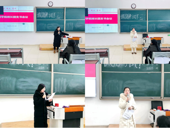 会议最后,分管副书记孟向红对会议进行总结。她说班长、团支书作为班级的主要学生干部在学院的教育教学、学生管理中发挥了很大作用,希望大家不辜负同学、老师的信任和期待,严格要求自己当好同学的表率,积极主动地履行工作职责当好桥梁和纽带。她对近期班级学生工作提出了要求,一是各班务必加强考风考纪教育,尤其是新生班级,讲清期末各类考试的规范和要求,确保不出现违纪违规现象;二是落实好学校工作要求,确保寝室安全规范用电,做好教寝室环境卫生督查工作;三是班级团支书要与思政委员一道协助辅导员做好班级政治理论学习、形势政策和主题宣讲、学生阶段性思想状况调研、文化活动、典型示范推荐等班级思想政治教育工作和安全稳定工作。