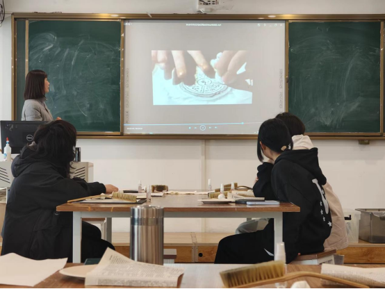 为了使同学们初步认识了解拓印艺术,博物馆展览部的副主任刘艳向同学们详细讲解了拓印的制作流程。她说,拓印技术是我国古老的一种印刷术,也是非物质文化遗产之一。同学们在博物馆同志的介绍下,了解了拓印的技法,接着观看了有关拓印的视频,并观赏了成品的拓印之作。