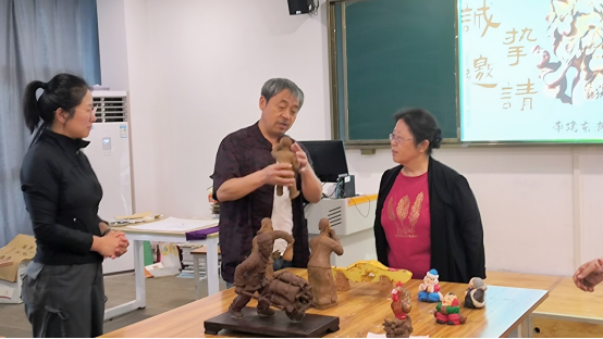 活动开始,负责人播放了纪录片“非遗文化泥塑大师李建东”的艺术成就和他所创作的经典作品。同学们从纪录片中了解到非物质文化遗产“泥塑”在淮北的悠久历史,同时也了解了李建东老师传承人的创作之路以及经典的作品。李老师告诉同学们,民间泥塑,主要是以泥巴为原材料,塑制成各种形象的一种手工艺。制作形式比较简单,没有任何制约,可以根据人们自身的喜好进行创作,他说“玩泥巴是人类的天性”,一句充满哲理的话让同学们对泥塑文化与制作产生了浓厚的兴趣。